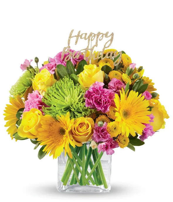 It's true: sparkles do make everything better! Overflowing with roses, carnations, gerbera daisies and a glittering "Happy Birthday" pick, this handcrafted bouquet puts the cherry on top of any celebration.