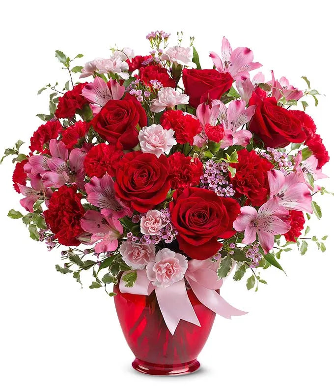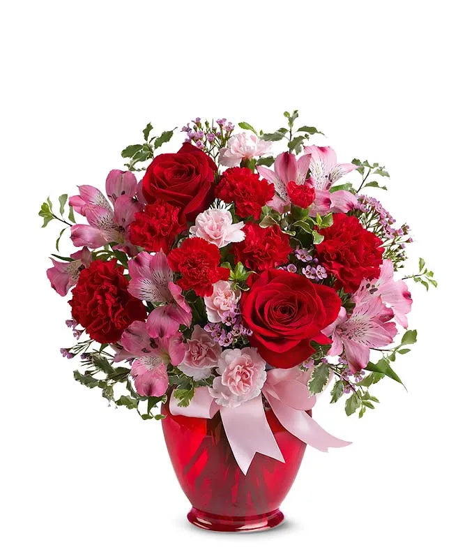 Let the whole world know how much she means to you with a delivery of the Blissfully Yours bouquet. The flower bouquet is arranged with a mix of different flower types all in either pink or red tones. The stand-out flower is the red rose which is paired by a local florist near the delivery address with pink alstroemeria, red carnations and pink wax flower. The roses, carnations and alstroemeria are delivered by hand in a bright red vase, wrapped with a pink bow.