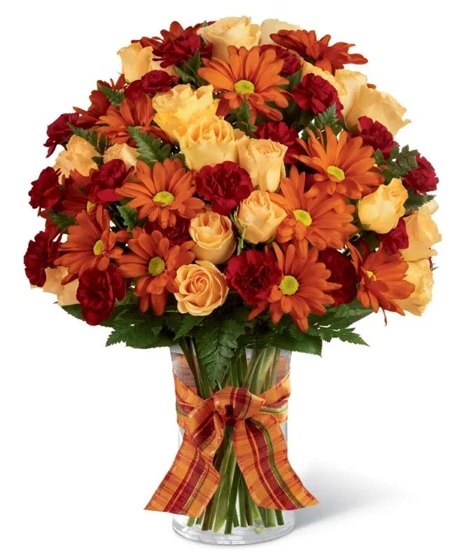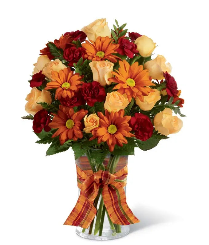 Celebrate the beauty of fall with this warm and cheerful bouquet. Featuring charming peach spray roses, rich burgundy mini carnations, and sunny butterscotch daisy poms, each bloom is perfectly arranged in a clear glass vase and finished with a festive plaid ribbon. It's a delightful gift for birthdays, thank-yous, or simply brightening someone's day with a touch of autumn charm.