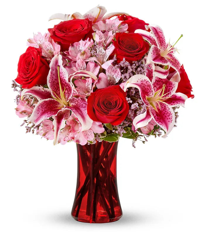 A love eternal, a bouquet that will tell them just that. This Eternally Bouquet is the perfect gift to tell someone that you have that enduring love. Striking red roses surrounded by stargazer lilies in a beautifully elegant vase. Make their day with this special delivery, perfect for any occasion!
