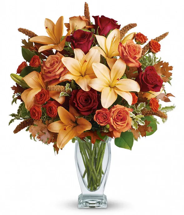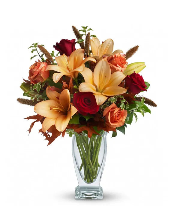 Roses, lilies and oak leaves create a fantasy of fall flowers. Send this tall, elegant arrangement to wish someone a happy day or birthday! The warm color palette and Couture Vase make a stylish seasonal statement.