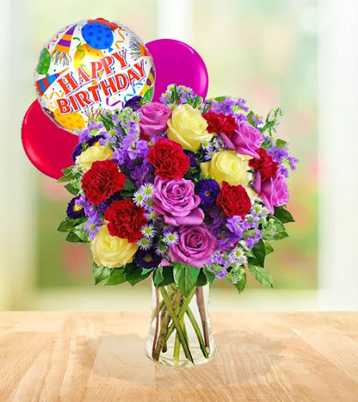 A richly colored flower arrangement with a mylar balloon is the perfect way to wish someone a Happy Birthday! This new take on our customer favorite blends together our favorite flowers.