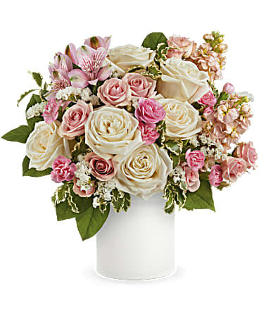 Crème roses, pink spray roses, pink alstroemeria, miniature pink carnations, pink stock and white sinuata statice are arranged with pitta negra and lemon leaf.