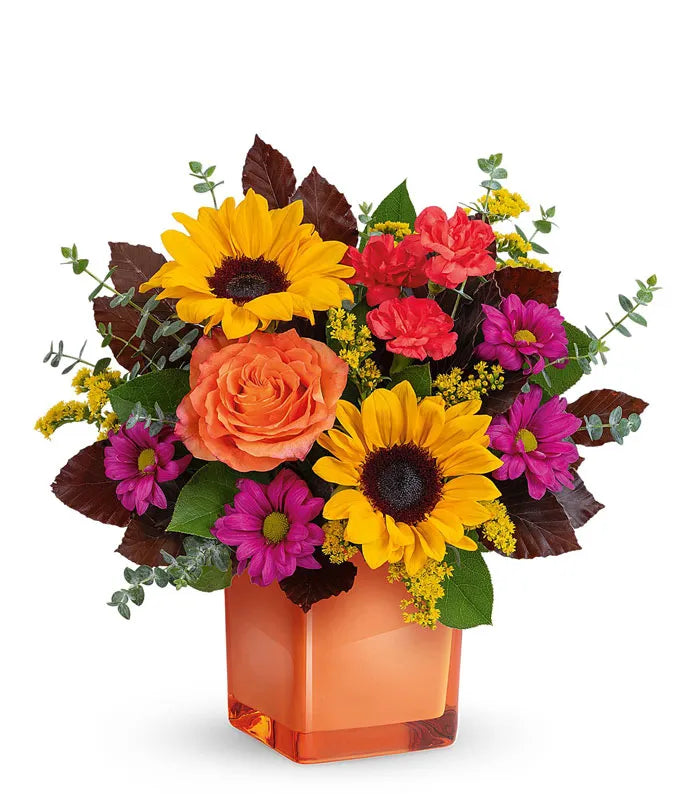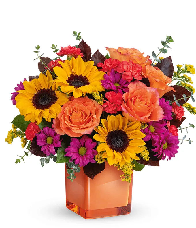 Bring warmth and cheer to any occasion with this vibrant arrangement. Featuring radiant orange roses, lively miniature orange carnations, sunny medium yellow sunflowers, and charming purple daisy spray chrysanthemums, it’s a stunning display of color and joy. Artfully arranged in a sleek coral cube vase, this bouquet is perfect for celebrating birthdays, sending smiles, or brightening someone’s day.