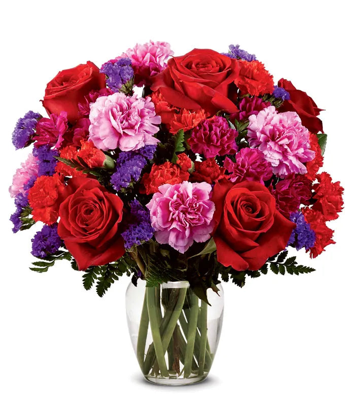 Express your love with this romantic bouquet of red, pink, and purple blooms, a stunning gift sure to make her smile all day. Hand-delivered in a red keepsake glass vase by a local florist, it’s a heartfelt gesture of affection and joy.
