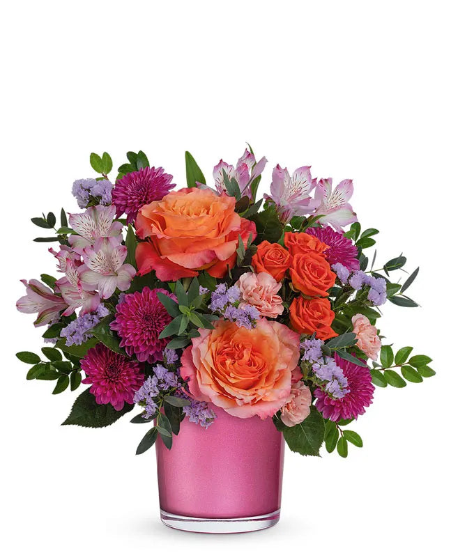 This vibrant floral arrangement is a perfect gift to send to loved ones. It features a delightful mix of orange roses, orange spray roses, purple chrysanthemums, pink alstroemeria, and lavender statice. Nestled in a shimmering pink vase, this bouquet adds a pop of color and joy to any occasion. The lush greenery provides a beautiful contrast, enhancing the vivid hues of the flowers.