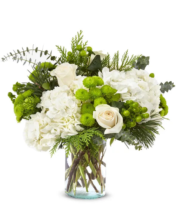 Bring natural elegance to any occasion with this lush arrangement of ivory roses, white hydrangea, green berries, and cheerful green button poms.